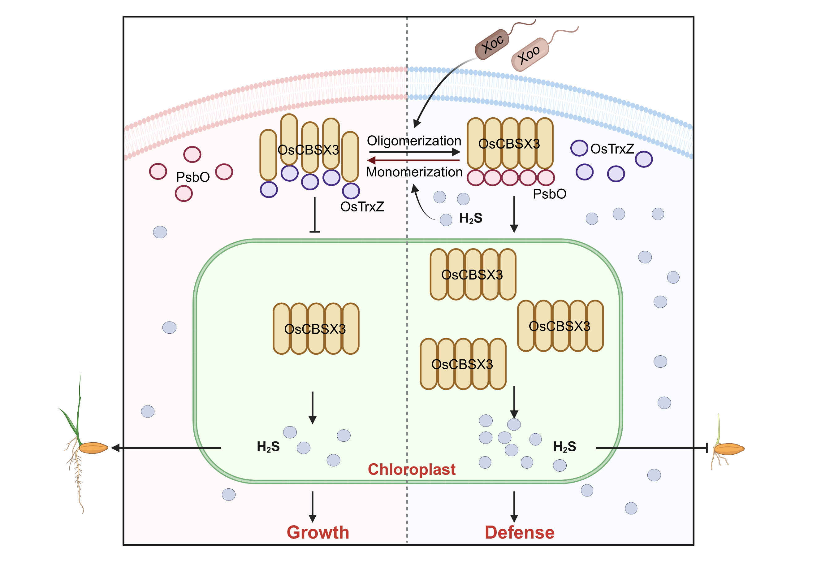 研究发现,OsCBSX3蛋白在水稻中以单体和寡聚体两种状态并存,OsTrxZ蛋白和PsbO蛋白在调控OsCBSX3单体与寡聚体转换过程中发挥着关键作用,这一过程对平衡水稻的生长与免疫至关重要。过表达OsCBSX3或PsbO能提升水稻H2S含量及其抗条斑病和白叶枯病的能力,oscbsx3和psbo突变体则表现出H2S含量减少及抗条斑病和白叶枯病能力降低。过表达OsTrxZ导致水稻H2S含量下降,且对条斑病和白叶枯病敏感性增加,而ostrxz突变体则展现出H2S含量上升及对这两种病害的抗性增强。当Xoc或Xoo入侵水稻后,依赖PsbO的OsCBSX3寡聚化水平逐渐升高,这一过程有助于OsCBSX3进入叶绿体促进H2S的合成,并进一步强化水稻的防御反应。此外,研究证实H2S可以作为一种免疫信号分子,能有效触发水稻体内活性氧的爆发,上调防御相关基因的表达,从而显著提高水稻对条斑病和白叶枯病的抗性。但当H2S浓度过高时,H2S会将OsCBSX3还原成单体,促进其与PsbO蛋白的解离,并加强其与OsTrxZ蛋白的结合。OsTrxZ蛋白通过催化OsCBSX3由寡聚体向单体的还原,精细地调节H2S的合成,以缓解H2S过度积累可能对水稻正常生长产生的不利影响。