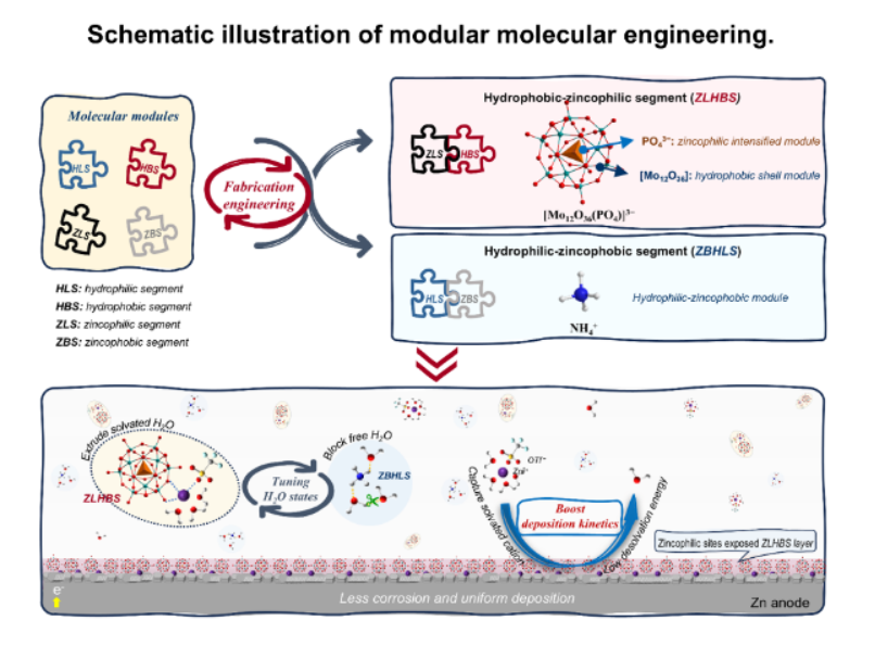 多酸团簇(POMs)作为一种单分子纳米材料在催化、医药、储能等领域表现出应用潜力。杨凯教授团队一直致力于POMs在储能领域的功能探索。首次证明了POMs在水系锌离子电池中的应用可行性,为POMs应用研究提供了新方向,并进一步结合POMs的水溶性和丰富表面活性位点系统研究,证实了POMs作为电解液添加剂具有协同优化电解液、电极的多功能特性,该成果入选ESI热点论文。近期,该团队结合实验和理论计算深入剖析POMs分子结构的亲/疏水和亲/疏锌特征,提出了一种电解液添加剂分子的模块化设计策略,以实现添加剂优化锌负极稳定性和可逆性的功效最大化。作为概念验证,使用候选模块化添加剂(NH4)3[PMo12O40]组装的水系锌离子电池在常温和低温下都表现出优异的容量保持率和长循环稳定性。这项工作为电解液添加剂设计开发提供了新的研究思路,推动了POMs结构创新研究和水系储能技术的实际应用进程。
