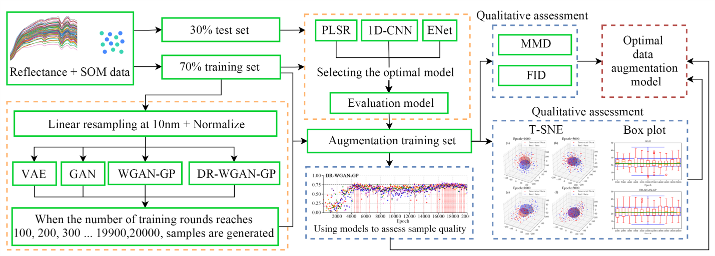 土壤有机质(soil organic matter,SOM)是衡量土壤健康和肥力的重要指标。高光谱遥感结合深度学习方法已成为快速预测SOM的有效手段,能够替代传统实验室分析。然而,由于野外样本采集受地形、环境等因素的限制,数据稀缺问题严重影响了深度学习模型的泛化能力,限制了对SOM监测中的应用效果。针对该问题,本研究基于生成式深度学习框架,对Wasserstein GAN with Gradient Penalty(WGAN-GP)进行改进,提出了一种融合均方残差损失的双重正则化WGAN-GP方法(dual-regularized WGAN-GP,DR-WGAN-GP),用于增强光谱反射率和SOM数据的生成质量。