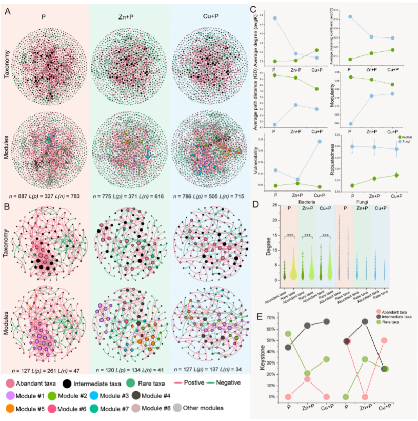 团队发现噻唑类农药能够显著降低马铃薯疮痂病的病情指数,并有效破坏病原菌的细胞膜完整性。层次分割分析表明,薯表土中稀有微生物类群对马铃薯疮痂病的解释度高于其他类群,这表明稀有类群可能是影响马铃薯疮痂病发生的关键微生物集群。在细菌的分子生态网络中,这些稀有类群的节点度普遍高于丰富类群的节点度,占据了网络的核心地位。然而,值得注意的是,农药暴露减少了微生物分子生态网络中keystone的数量,并削弱了这些网络中稀有类群的keystone占比。