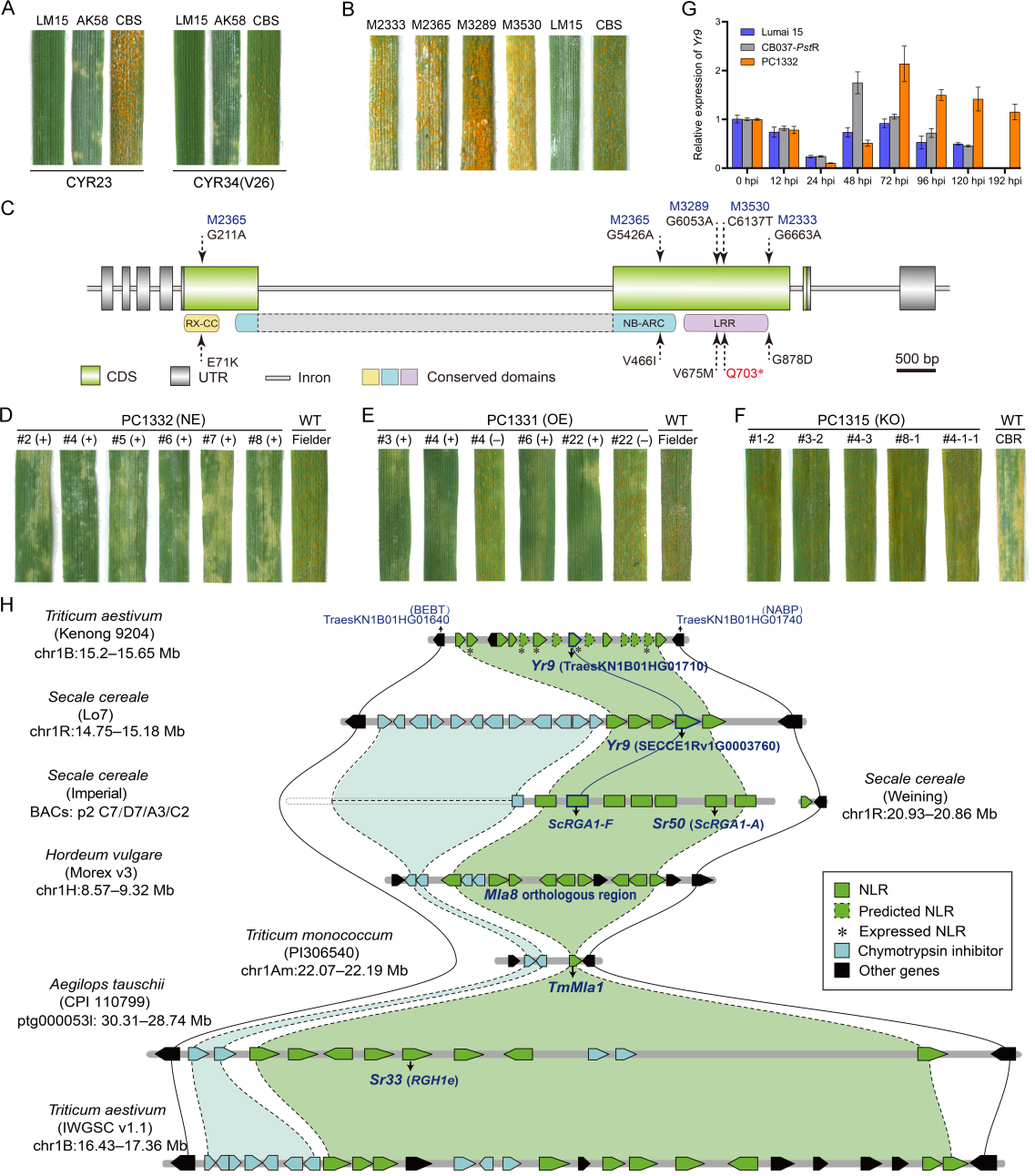 研究人员对“鲁麦15”开展了抗条锈病遗传分析,通过最近开发的突变体分析技术STAM(Sequencing Trait-Associated Mutations)(Ni et al., Nature Communications. 2023),鉴定到一个候选基因,编码NLR(Nucleotide-binding Leucine-rich Repeat)抗病蛋白。通过自然表达、过量表达、基因编辑等多种方法证明了该基因即为黑麦来源、在生产上被广泛利用的抗条锈病基因Yr9。研究人员还发现Yr9位于一段大约400 Kb的抗病基因簇,其中包含至少14个NLR基因。该基因簇在不同物种中具有良好的保守性,并分化出多个针对不同病害的抗病基因,包括在大麦中发现的既抗大麦白粉病也抗小麦条锈病的基因Mla8、在一粒小麦中发现的抗白粉病基因TmMla1、野生祖先种节节麦来源的抗秆锈病基因Sr33,黑麦中发现抗秆锈病基因Sr50等。研究结果不但解析了1BL/1RS易位系材料抗条锈病的遗传基础,而且为Yr9基因的分子育种应用以及新基因挖掘提供了重要参考。