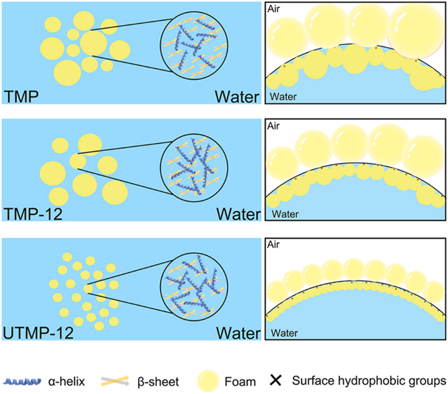 为改善TMP的起泡性能,本研究采用了极端pH值调节联合高强度超声(High-Intensity Ultrasound, HIUS)处理的方式对其进行改性。研究结果表明,在强碱性条件下,TMP对HIUS的响应更为显著。在该条件下,蛋白质分子发生解折叠,超声产生的空化效应破坏了大量非共价键,导致大量可溶性聚集体解离,从而减少了蛋白质粒径,暴露出疏水基团,提高了表面疏水性,并增加了游离巯基含量。此外,改性处理还改变了TMP的二级和三级结构:α-螺旋含量增加,而β-转角和β-折叠含量减少。这些结构变化提升了蛋白质在水-空气界面的界面性能,使得改性后的蛋白(UTMP-12)表现出优异的起泡性能。本研究为TMP在充气食品中的应用提供了一种新的思路和方法。