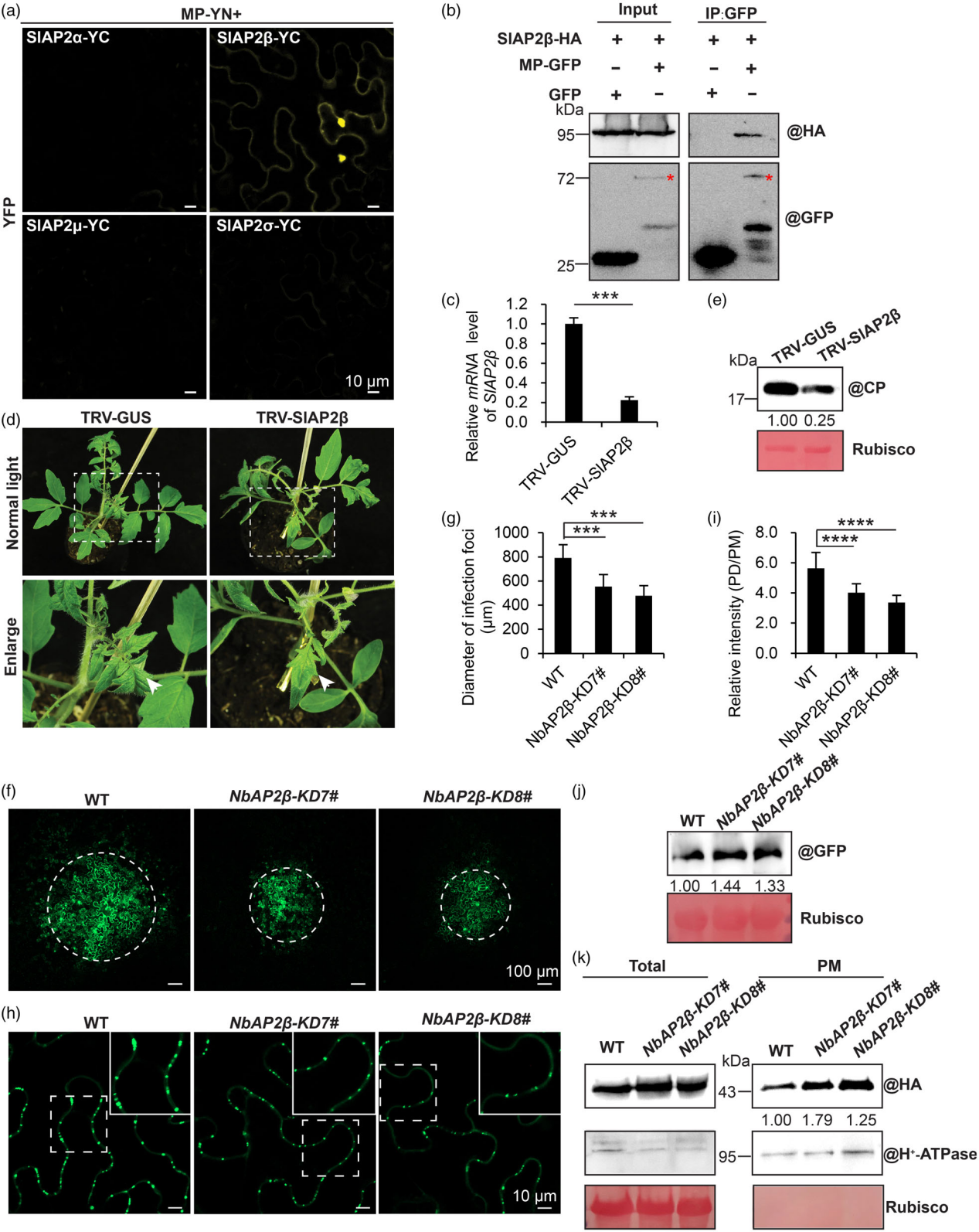 为测试SlAP2β在ToBRFV侵染中的作用,研究者通过TRV载体在番茄植株中沉默了SlAP2β(图3C)。随后,研究者将ToBRFV接种到SlAP2β沉默和非沉默的番茄植株中。在接种后8天,接种TRV-SlAP2β的植株系统叶表现出的症状比接种TRV-GUS对照的植株轻(图3D)。Western blotting结果显示,沉默SlAP2β降低了ToBRFV的积累水平(图3E)。研究者进一步构建了NbAP2β-KD转基因本氏烟系NbAP2β-KD7#和NbAP2β-KD8#。共聚焦显微镜分析显示,NbAP2β-KD植株浸润叶片中的ToBRFV-GFP侵染点小于对照植株(图3F和3G)。此外,研究者发现NbAP2β的敲低显著降低了胞间连丝和质膜处GFP的相对荧光强度(图3H和3I)。尽管ToBRFV MP在胞间连丝的定位减少,但其在NbAP2β敲低叶片中的总积累水平显著高于对照植株(图3J)。这些结果表明AP2β参与MP转运到胞间连丝。