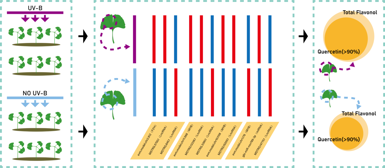 随着环境紫外线(UV)强度的增强,紫外胁迫成尤其是紫外线B(UV-B)胁迫成为了在植物生长过程中不可忽视的环境因素。目前已有相关研究表明,银杏可以通过类黄酮的积累来应对UV-B胁迫,且调控银杏类黄酮合成的结构基因与转录因子也被广泛的发掘并研究。然而在UV-B辐射下LncRNA-miRNA-mRNA协同调控银杏类黄酮合成的分子机制尚不明确。