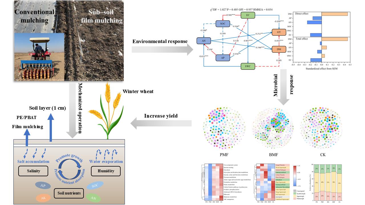 研究表明,地膜覆盖可以抑盐保墒,并促进了作物对养分的吸收,从而提高冬小麦的产量。其中,土下生物降解地膜覆盖处理可以有效调节土壤水盐状况,促进了有益微生物的富集,获得了更为稳定的细菌结构网络,最终取得与聚乙烯地膜覆盖处理相近的产量。研究结果可为土下覆膜技术在滨海盐碱地区的应用以及生物降解地膜替代聚乙烯地膜实现冬小麦绿色增产提供了理论指导。