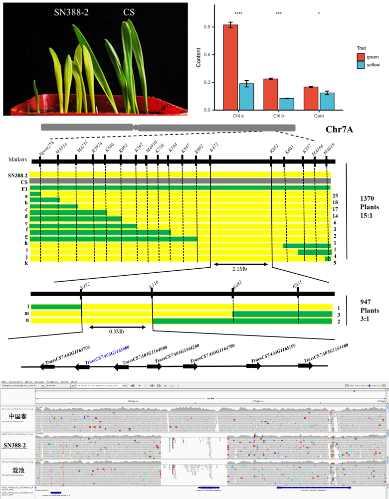 小麦黄叶突变体是研究作物叶绿素合成、叶绿体发育和光合作用机制的重要基础材料。李兴锋教授团体长期从事远缘杂交和小麦种质资源创新研究,在普通小麦和六倍体小黑麦复合杂交后代代中筛选到一份特殊的叶片黄化新种质SN388-2,遗传分析和分子标记定位结果表明其黄化性状受小麦7A和7D染色体上两对隐性基因控制。基于图位克隆和染色体结构变异检测技术,发现小麦Y1-7A编码的CHLI蛋白缺失导致SN388-2叶绿素合成受阻;CHLI蛋白属于ATP活性的镁螯合酶家族,亚细胞定位表明该CHLI蛋白在叶绿体上发挥作用;通过WGCNA分析挖掘了SN388-2叶绿素含量恢复相关6个关键的Hub基因。Y2-7D的候选基因有待后续研究验证。