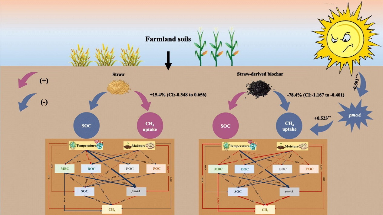 探明增温与干旱对秸秆和生物炭改良农田系统土壤碳-甲烷反馈效应具有重要意义,但其交互作用仍需更全面的量化研究。通过整合培养试验与全球Meta分析(105组观测数据),本研究系统评估了增温与干旱对不同碳改良土壤中甲烷氧化功能的影响路径。结果发现,干旱通过协同削弱甲烷氧化功能(pmoA基因丰度)和微生物碳含量,使土壤 CH₄ 氧化量下降 58.9%,并削弱甲烷氧化的热敏感性。增温引发相反的甲烷汇响应,刺激秸秆粉碎还田土壤CH₄氧化(增幅15.4%,CI: 0.348–0.656),削弱秸秆炭化还田土壤甲烷氧化活性(降幅78.4%,CI: 1.167–0.401)。增温条件下土壤有机碳(SOC)含量呈现矛盾动态,短期损失和长期累积,凸显了长期原位验证的必要性。