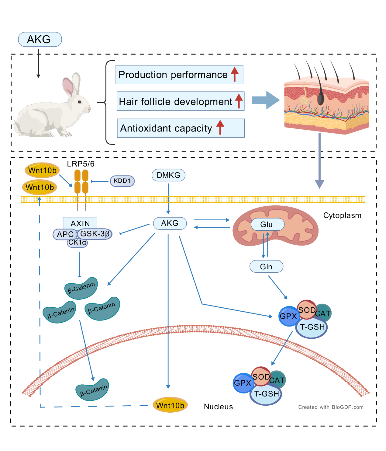 从经济价值来看,獭兔因其肉用和毛皮生产而具有重要意义。然而,随着毛皮动物产业对毛皮品质日益增长的重视,优化獭兔的毛皮品质现已成为实现利润最大化的关键目标。AKG是三羧酸循环(TCA)中一个关键的限速中间产物,在细胞能量代谢中扮演着重要角色;AKG在细胞内主要通过谷氨酰胺-AKG轴发挥功能,通过谷氨酸脱氢酶、谷氨酰胺合成酶、谷氨酰胺转氨酶和ω-酰胺酶实现两种化合物之间的相互转化。本研究旨在探究补充AKG对獭兔毛囊发育的影响,并评估其对生产性能和抗氧化能力的作用,其作用机制通过体外模型探索并在动物试验中得到验证。该研究结果表明,AKG显著提高獭兔生产性和抗氧化能力,并且通过激活Wnt/β-catenin信号通路和调节氨基酸代谢,显著促进獭兔毛囊发育,为毛皮动物绿色养殖提供了新策略。