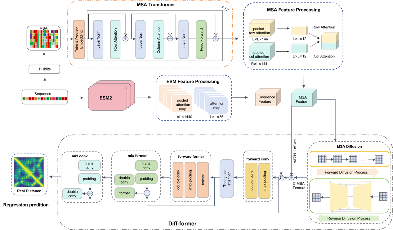 团队基于ESM与MSA Transformer两个大模型构建了MF-ProtDisMap 大模型框架,该框架通过三项核心设计实现了性能提升:其一,双通道特征提取模块同时捕捉蛋白质序列特征与共进化语义信息;