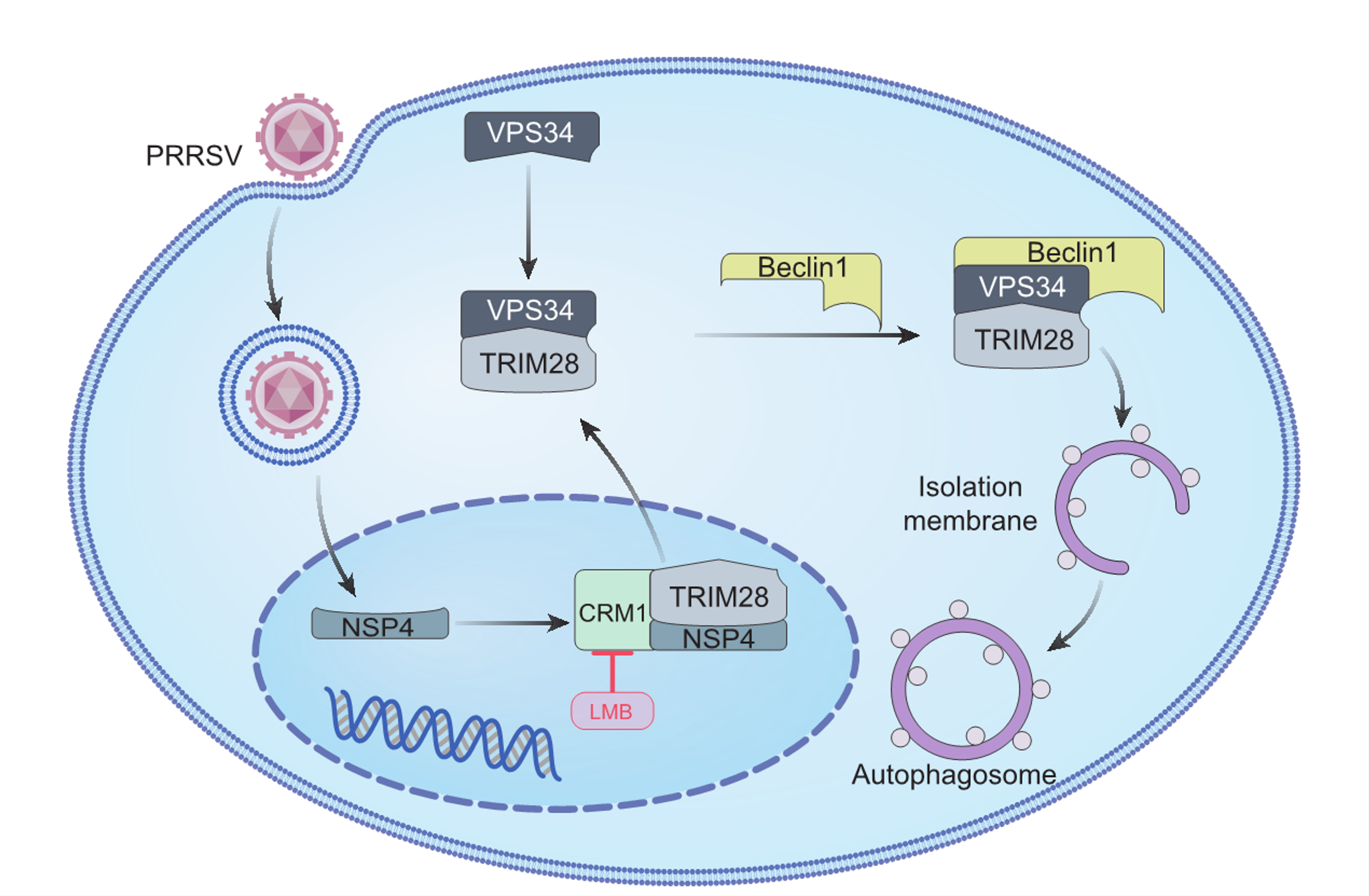 本研究发现PRRSV感染早期,细胞自噬启动与宿主分子TRIM28的核转位现象同步发生。进一步的机制研究表明,病毒非结构蛋白4(NSP4)通过与核输出受体CRM1结合,将部分TRIM28由细胞核转移至细胞质中;转位后的TRIM28在胞质中充当“分子支架”,显著增强自噬调控蛋白Vps34和Beclin1之间的相互作用,进而启动自噬体的形成。该研究不仅揭示了一条PRRSV诱导自噬的全新信号通路,也从蛋白翻译后修饰层面深化了对病毒与宿主相互作用机制的理解,为系统阐明PRRSV的致病机理以及开发靶向自噬过程的抗病毒策略提供了重要理论依据。
