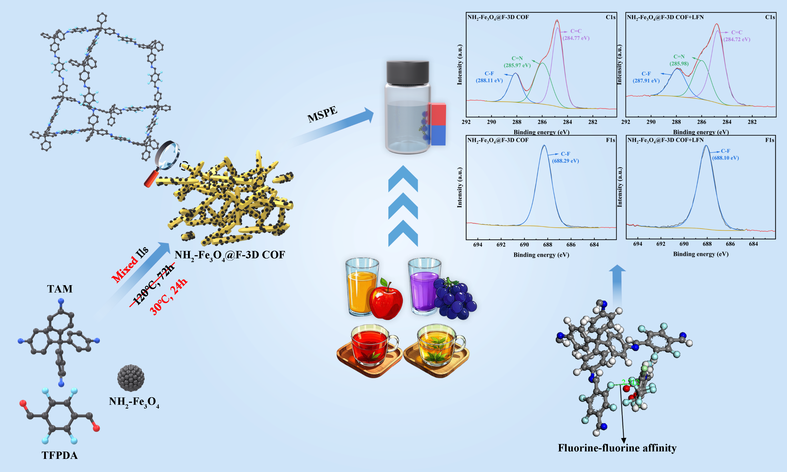 苯甲酰脲类杀虫剂(BUs)作为一种独特的昆虫生长调节剂,与传统神经毒性杀虫剂不同,它通过靶向昆虫体内的几丁质合成破坏其蜕皮过程,并抑制其生长发育。尽管BUs因功效显著被广泛用于保护农作物,但存在降解速度较慢,易对人类健康和生态系统构成潜在威胁等突出。因此设计一种简单、快速和高灵敏度的BUs分析检测方法起着至关重要的作用。与二维COFs相比,三维(3D)COFs的分子单元通过空间中的共价键形成3D网络结构,使得它们具有高度互连的多孔结构,突出暴露的活性位点和出色的热稳定性。课题组采用混合离子液体介导的Schiff聚合方法,在室温下成功合成磁性结晶氟功能化3D COF(NH₂-Fe₃O₄@F-3D COF),发现并证实其高效检测果汁和饮料中的 BUs。这成果对于识别和定量复杂基质食品中存在的污染物表现出广泛应用前景。
