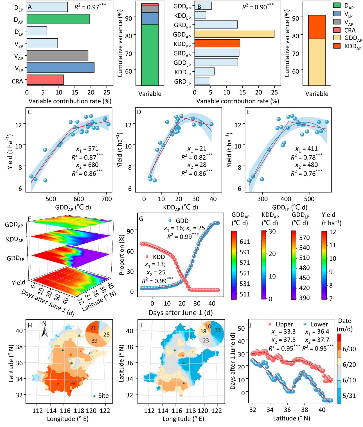 基于此,研究提出了分区播期优化建议:约28%的区域(尤其是34°N以南)宜在6月25日之后播种,以减轻关键生长期的热胁迫;约14%的区域(尤其是39°N以北)应在6月20日前播种,以确保灌浆期积温充足;其余大部分地区则推荐于6月5日至30日之间播种,以实现光热资源的高效利用。