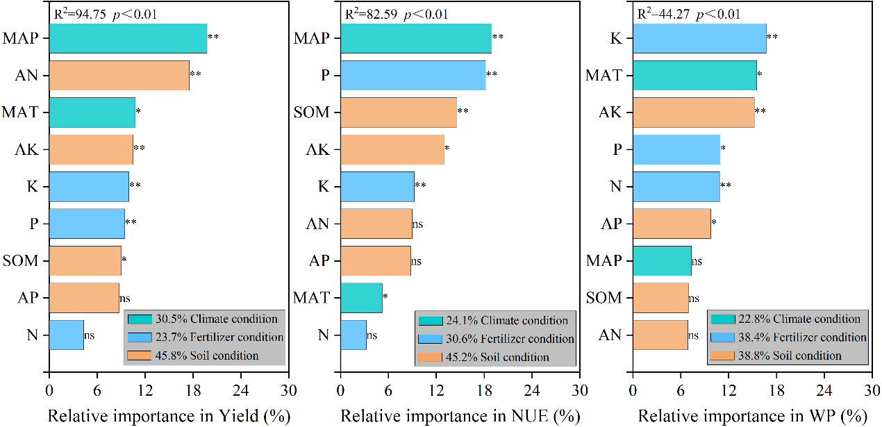 研究发现,与常规条播相比,宽幅播种使小麦产量提升9.9%、氮素利用效率(NUE)提升9.3%、氮素吸收效率提升(NUpE)10.2%、水分生产力(WP)提升4.8%。土壤条件对宽幅播种下的小麦产量、氮素利用效率和水分生产率影响最大,尤其是适宜的土壤有机质含量和速效钾含量。肥料和气候因素也会影响宽幅播种小麦的综合生产能力。随机森林回归模型显示,小麦生产中应更加重视钾肥和磷肥的施用,以更大程度实现宽幅播种的增产效应。此外,在年平均降水量较高(>600毫米)、年平均气温适中(10-13℃)的条件下,宽幅播种更易实现产量、氮素利用效率和水分生产力的协同提升。综上,宽幅播种可显著提高小麦综合生产能力,研究为小麦大面积单产提升行动中持续推广宽幅播种技术提供了新的参考和借鉴。