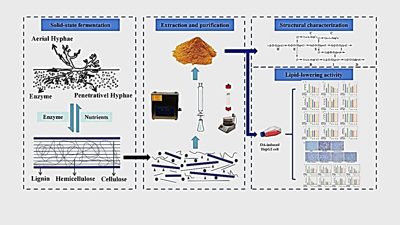 近日,食品科学与工程学院张锦丽副教授团队在《Carbohydrate Polymers》发表了题为“Polysaccharide from Ganoderma lucidum-fermented wheat pericarp: Purification, structural features, and lipid-lowering mechanisms”的研究论文。该研究通过食药真菌固态发酵技术,成功提升了小麦加工副产物的价值,并深入阐释了其活性成分的降脂机制,为功能性食品开发提供了新路径。
