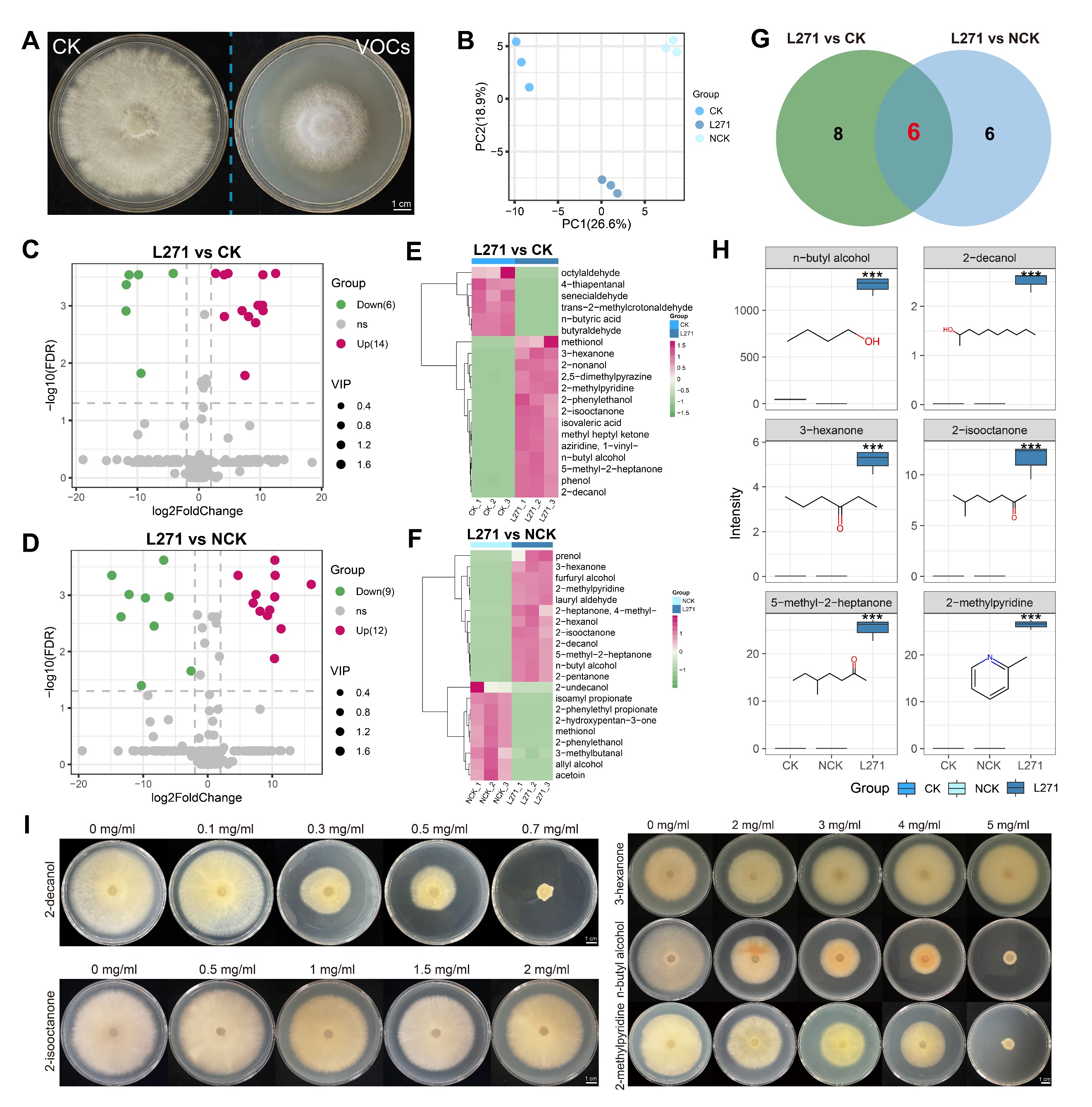 L271菌株能有效抑制腐皮镰刀菌的孢子萌发,使大蒜镰刀菌腐烂病的病斑直径减少87.60%。进一步研究发现,L271无细胞上清液可严重破坏腐皮镰刀菌的细胞膜,并诱导其细胞内活性氧(ROS)爆发。为明确抑菌机理,深入分析了L271菌株无细胞上清液成分,发现其外泌蛋白和代谢产物均具有抑菌活性。通过液相色谱-质谱联用(LC-MS)、全二维气相色谱-飞行时间质谱联用(GC×GC-TOF-MS)进行了代谢组学分析,结合代谢物拮抗验证实验,鉴定出非挥发性有机物4-羟基苯甲腈、2,3-二羟基苯甲酸和挥发性有机物2-癸醇为L271合成的主要抑菌物质(图2)。