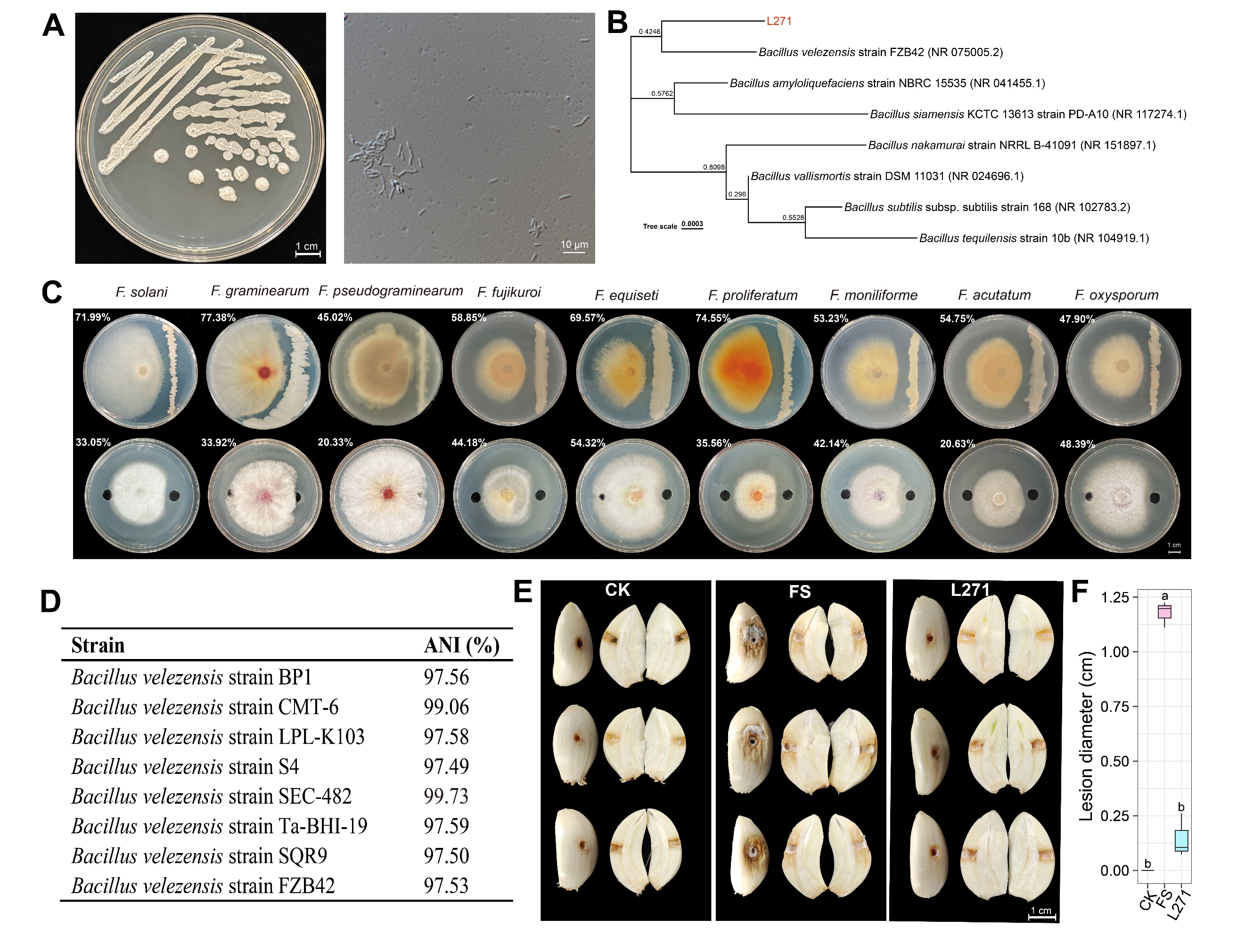 图1. 贝莱斯芽孢杆菌L271的分离鉴定及体内/外生防效果