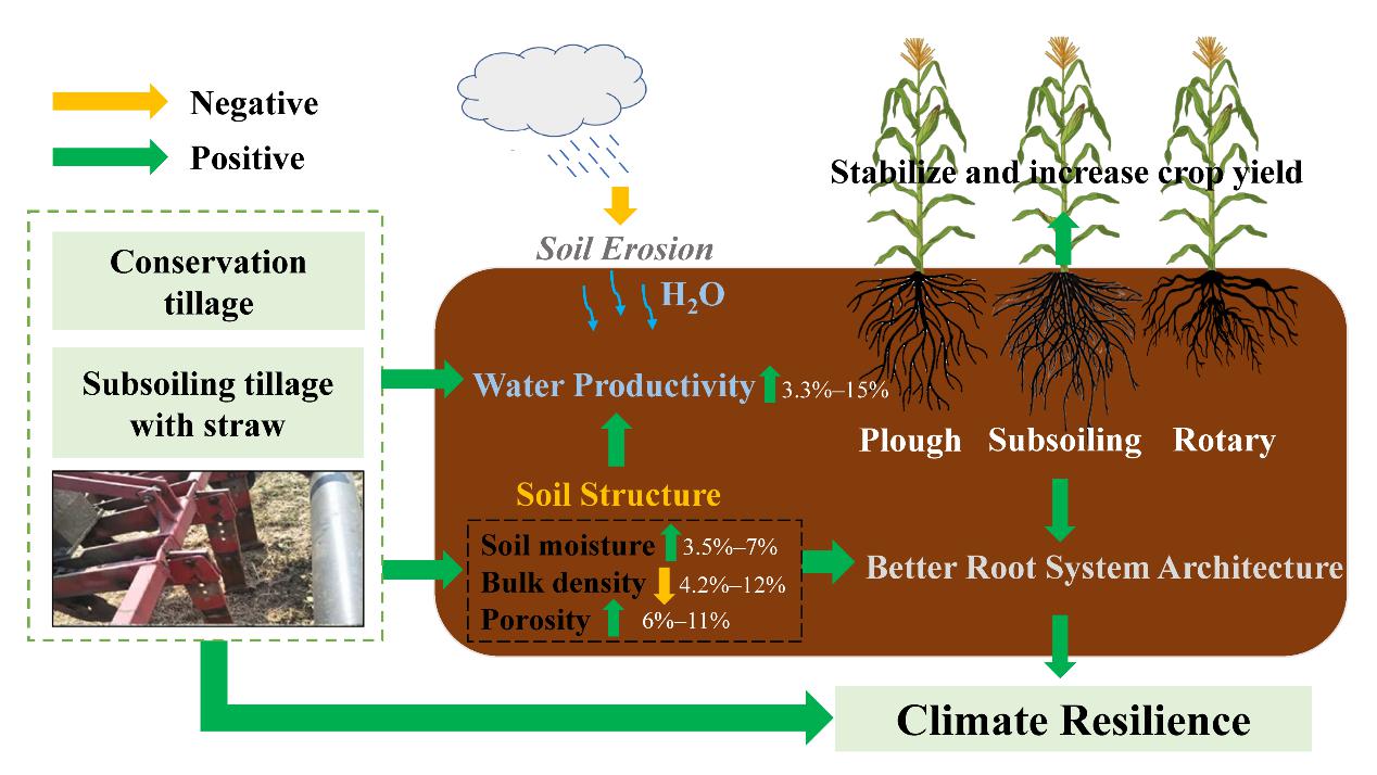 全球气候变化与水肥利用效率低下对农业生产构成挑战,长期翻耕导致的底土压实限制了作物根系生长和水肥吸收。该研究基于长期定位试验发现,深松结合秸秆还田能有效打破犁底层,改善土壤结构。该措施显著优化了玉米根系的空间构型,促进根系向深层土壤延伸,形成更发达粗壮的深层根系,从而增强作物对深层水肥的获取能力。优化后的根系构型提升了植株对深层土壤储水的利用,在维持高产的同时显著提高了水分利用效率,实现了节水与增产的协同。该研究通过保护性耕作措施优化根-土互作、提升玉米生产系统的资源效率和气候韧性提供了重要的理论依据与技术途径。