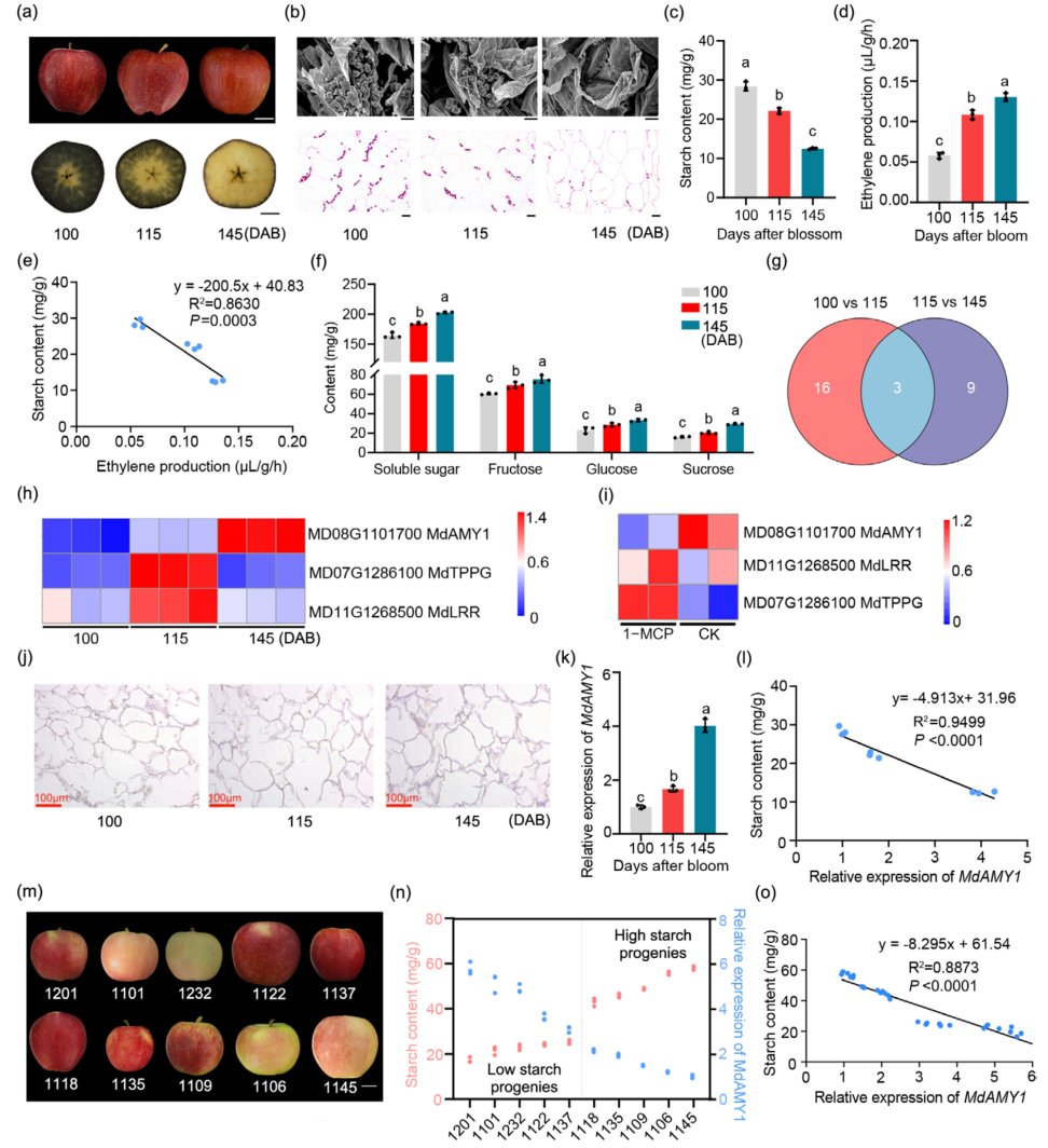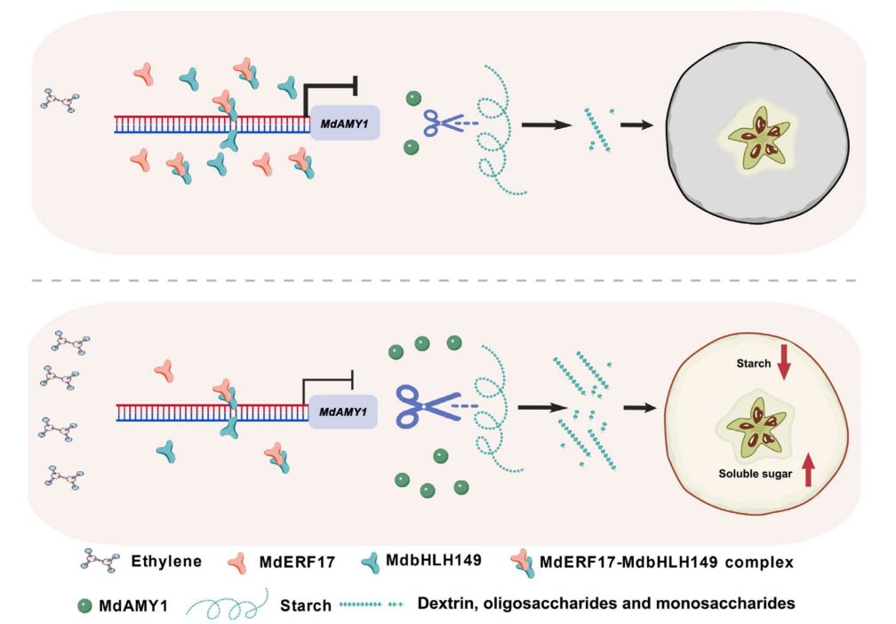 苹果(Malus domesticaBorkh.)是全球广泛消费的重要水果,富含多种矿物质和维生素。作为典型的呼吸跃变型果实,苹果在成熟过程中伴随乙烯产量的显著升高以及淀粉向可溶性糖的快速转化,该过程直接影响果实甜度形成与风味品质。然而,乙烯信号如何精细调控苹果淀粉降解进而实现淀粉向可溶性糖转化的分子机制仍不清楚。因此,系统解析乙烯介导的淀粉降解调控通路,鉴定其中的关键调控因子及其相互作用关系,对于深入理解果实成熟机制和提升果实品质具有重要的理论意义和应用价值。