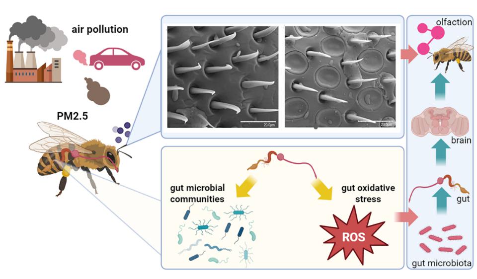 在过去一个世纪中,传粉昆虫的数量与多样性持续下降,空气污染是重要诱因之一。PM2.5作为一种危害显著的空气污染物,粒径小、比表面积大、反应活性强,可携带多种有毒物质,并能在植物花朵与传粉昆虫体表沉积。蜜蜂是自然界中关键的传粉昆虫,长期被用作评估空气污染影响的生物指示物种。然而,PM2.5究竟如何影响蜜蜂的感官功能与生理状态,此前尚缺乏系统阐明。该研究通过设计空气污染物可控暴露蜜蜂饲养系统,发现PM2.5可在蜜蜂触角鞭毛与感受器上沉积并聚集成簇,形成物理覆盖层,导致蜜蜂对低浓度蔗糖溶液的感知能力显著下降。进一步研究表明,PM2.5会导致肠道核心共生菌Snodgrassella丰度显著降低,潜在条件致病菌Serratia丰度增加,并提高肠道氧化应激水平。该研究系统阐明PM2.5可同时损害蜜蜂的嗅觉感知、肠道菌群稳态和抗氧化防御系统,并基于“肠—脑轴”理论提出了潜在的作用机制框架,为理解环境污染物对传粉昆虫健康的影响提供了重要科学依据。