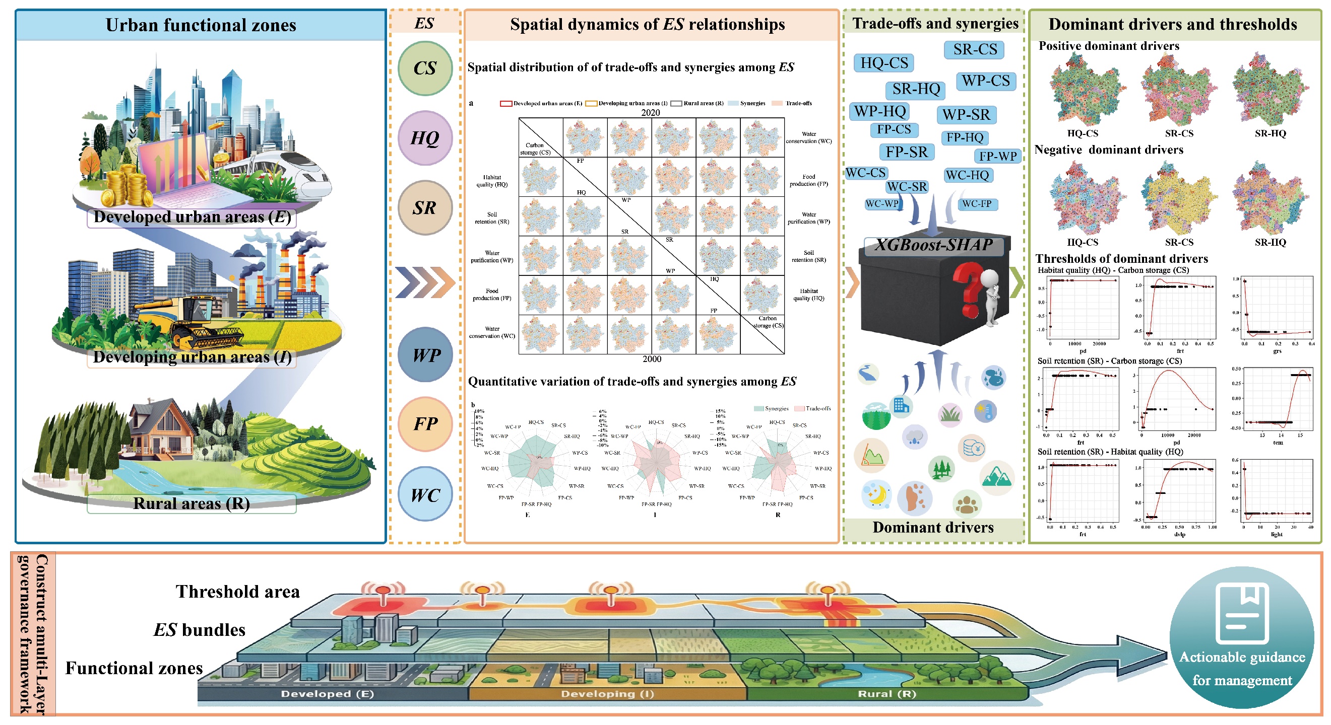 耦合条件下生态系统服务权衡—协同关系的空间分异机制及其关键驱动阈值,为分区精准治理提供了量化依据。