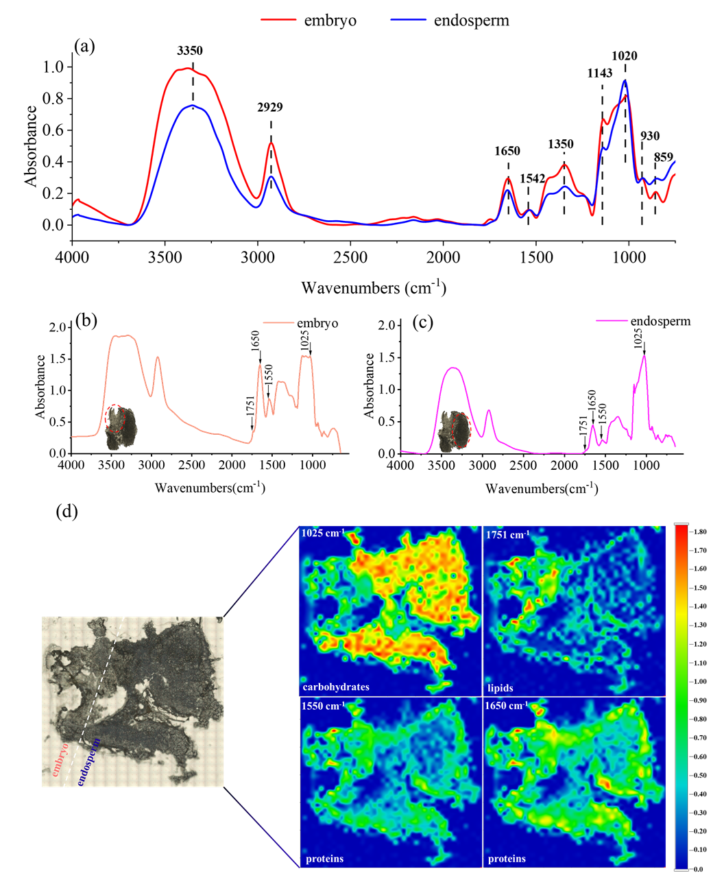 图2 健康小麦籽粒胚乳/胚微组织的SR-FTIR光谱图